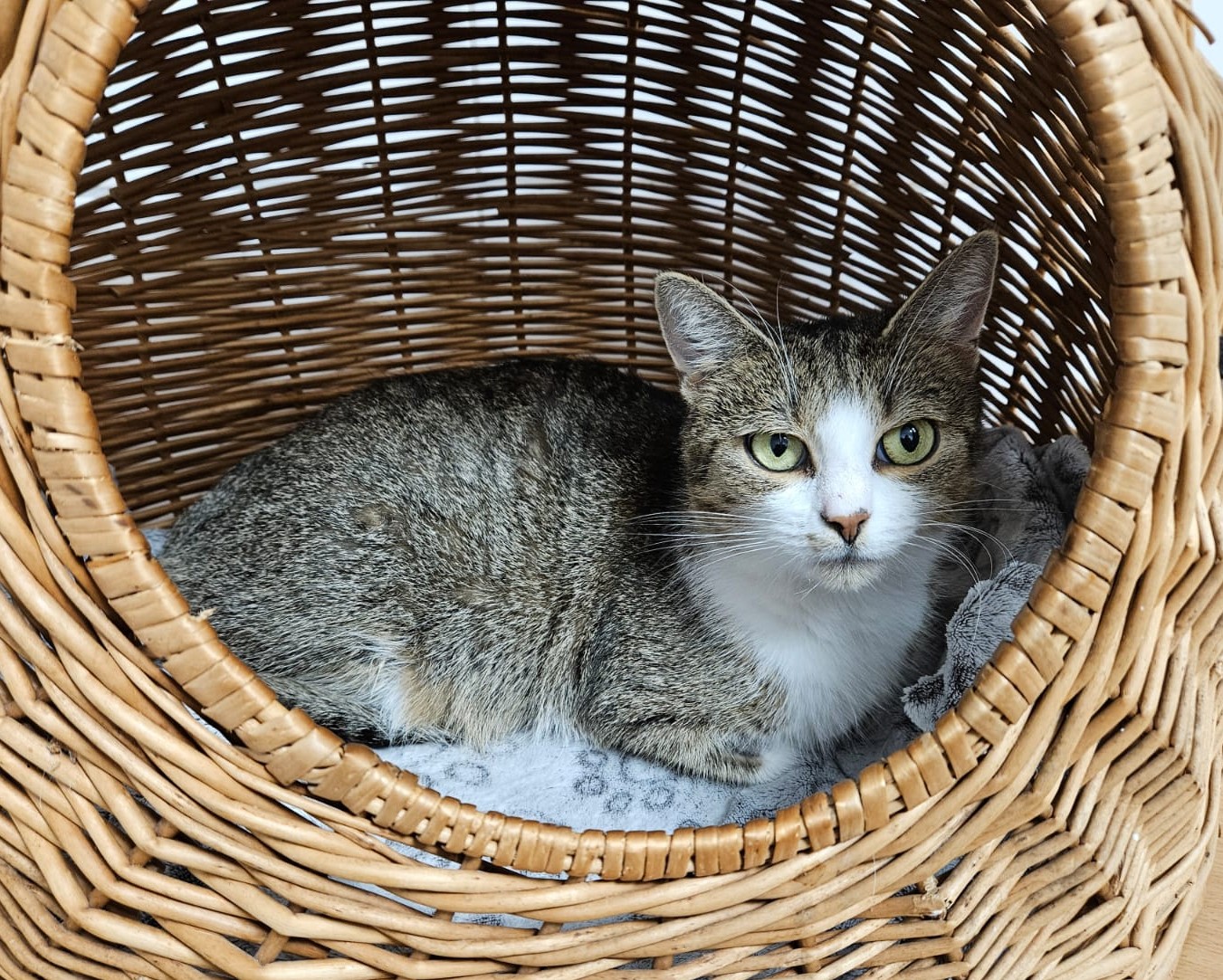 Unsere hübsche Julia kam als Fundkatze ins Tierheim – weder ihr Alter noch ihre Vorgeschichte sind bekannt. Anfangs war sie sehr zurückhaltend und verbrachte die meiste Zeit gut versteckt in ihrer Kuschelhöhle.